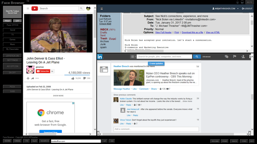 My software is shown in real world use, but has no relation or approval by Facebook.  FaceBrowser™ is a stand alone web browser that can use any website.  Maybe even replace facebook... who knows... it's now up for sale with backup software copies and websites and domains.  Buy the brand by submitting a commercial offer in writing to :